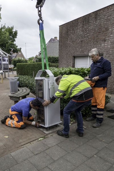 Vor Jahren fanden Freek Diersen und Johannes Hoven bei Ihrer Spurensuche nach noch vorhandenen Grenzzeichen entlang der Grenze zwischen Suderwick und Emmerich/Beek zum einen das Untergestell der Schranke, die schon länger am Grenzübergang „Brüggenhütte“ steht. Es handelte sich um ein Exemplar, das handbetrieben wurde und keinen Schlagbaum mehr besaß und früher am Grenzübergang zwischen Isselburg und Megchelen stand. Zum anderen fand man darüber hinaus eine noch vollständig erhaltene und funktionierende elektrisch betriebene Schranke, die nun frisch platziert wurde. Sie stand früher auf dem Gelände des Grenzübergangs an der A 3 in Emmerich. Man brauchte einen „langen Atem“, um in den Besitz der Erinnerungsstücke zu gelangen.