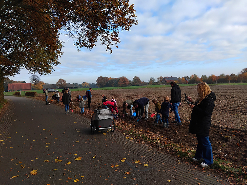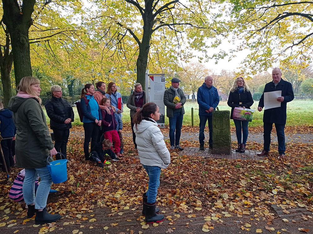 Wie im letzten Beitrag angekündigt, pflanzten deutsche und niederländische Kinder am 8. November 2025 gemeinsam mit ihren Eltern, Großeltern und weiteren Helfern an der Keupenstraat, der Grenzstraße zwischen Suderwick und Dinxperlo, etwa 12.000 Zwiebeln von Frühlingsblumen. Ab dem kommenden Frühjahr werden dort unter anderem Krokusse, Kiebitzblumen, Narzissen, Wildtulpen, Zierlauch und Prä-rielilien Menschen erfreuen und Insekten als Nahrung dienen. Mit dieser Aktion soll-ten die Kinder zusammen etwas für Natur und Umwelt tun, die Grenze kennenlernen und verschönern. Es handelte sich um die dritte Pflanzaktion dieser Art und zugleich um eine grenzüberschreitende Aktivität zum Abschluss der Veranstaltungen zur Er-innerung an 80 Jahre Frieden und Freiheit in Suderwick und Dinxperlo.